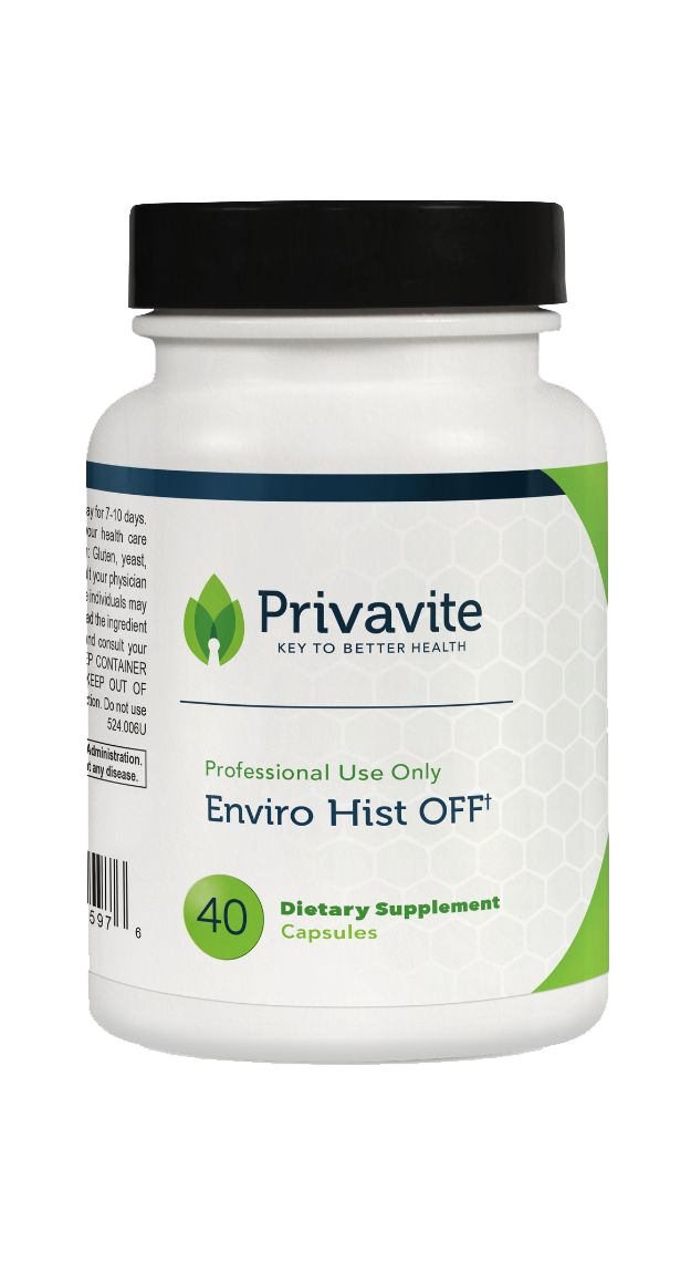 Enviro Hist OFF is a targeted blend of flavonoids, antioxidants, proteolytic enzymes and botanicals designed to provide comprehensive support for seasonal challenges caused by common environmental allergens. The formula includes quercetin, bromelain, stinging nettles leaf and N-acetyl cysteine. The powerful combination actively promotes healthy nasal and sinus passages for individuals with elevated histamine and respiratory irritation.